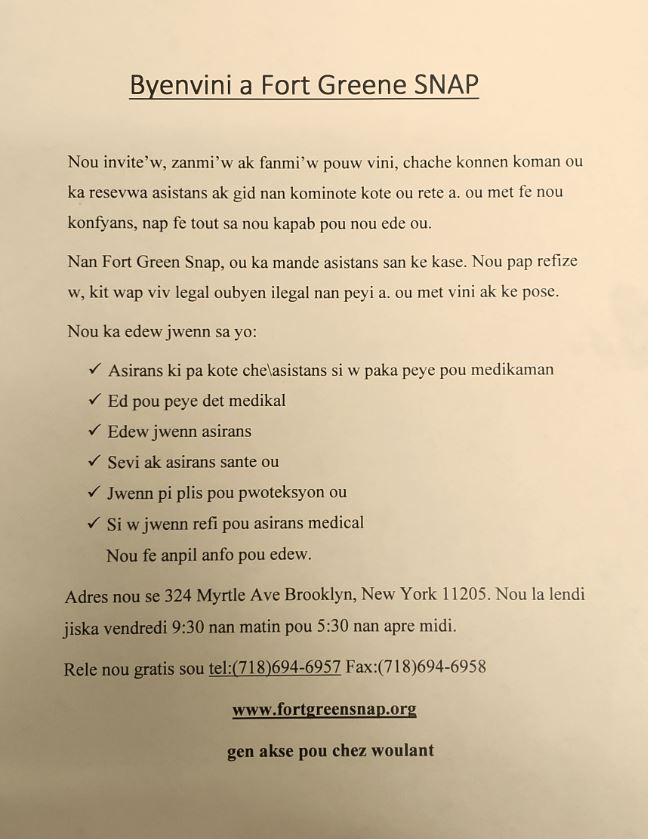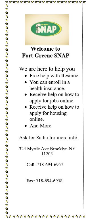 Fort Greene SNAP helps community residents of Fort Greene, Clinton Hill and the surrounding communities understand and learn the tools that can help them take control of their lives and make positive decisions that lead to a fuller quality of life.