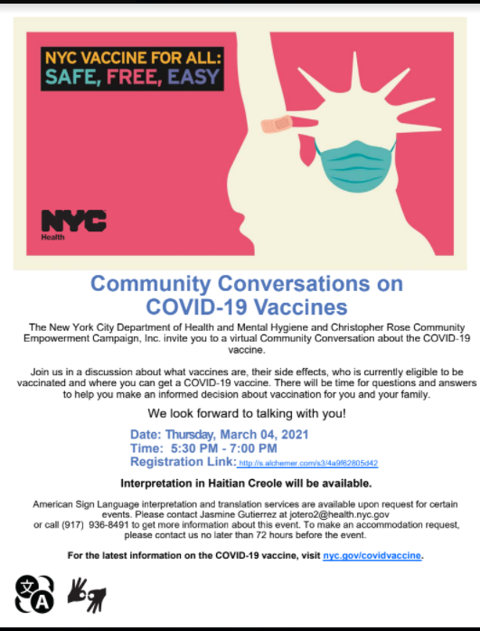 Comments Off on The New York City Department of Health and Mental Hygiene invites you to a virtual Community Conversation about the COVID-19 vaccine.