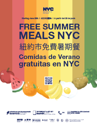 This Summer, New Yorkers can get free “grab and go” meals at locations across the five boroughs beginning June 28, 2021. No registration, documentation, or ID is required to receive a free breakfast or lunch. For more information or to find a location near you visit www.schools.nyc.gov/summermeals or call 311 or text “NYCFOOD” or “NYCCOMIDA” to 877-877 (text messaging and data rates may apply).