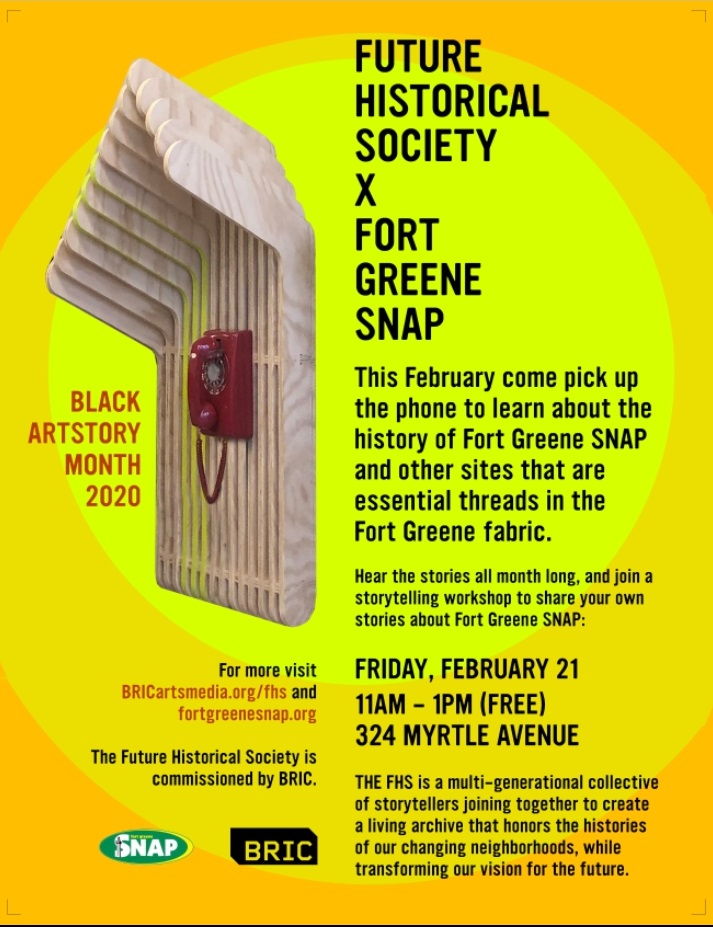 This multi-generational collective of Fort Greene neighbors leads an interactive storytelling and history-collecting workshop and installation, focusing on the vital role that Myrtle Avenue and Fort Greene SNAP has played in our community. In connection with this year’s Black Art Story Month theme, Some Words, this FHS ( https://www.bricartsmedia.org/…/c…/future-historical-society ) workshop provides a forum for sharing history and meaning in one’s own voice and words, while creating an archive to preserve, interpret, and share those words through an artistic and community-created public art installation.